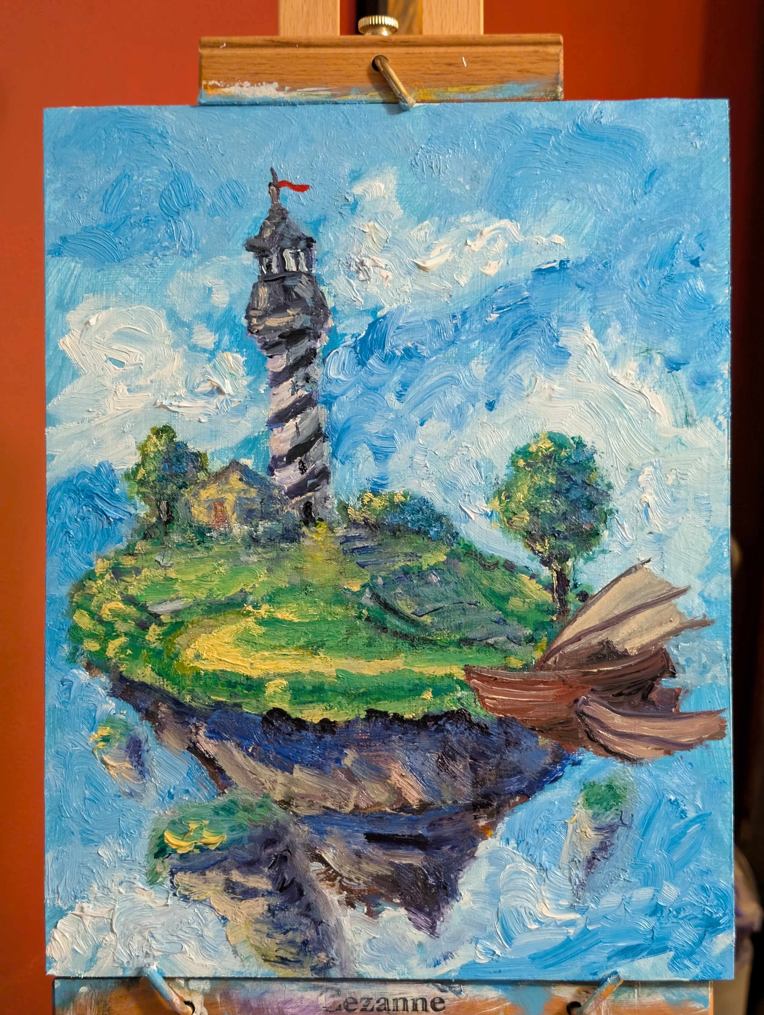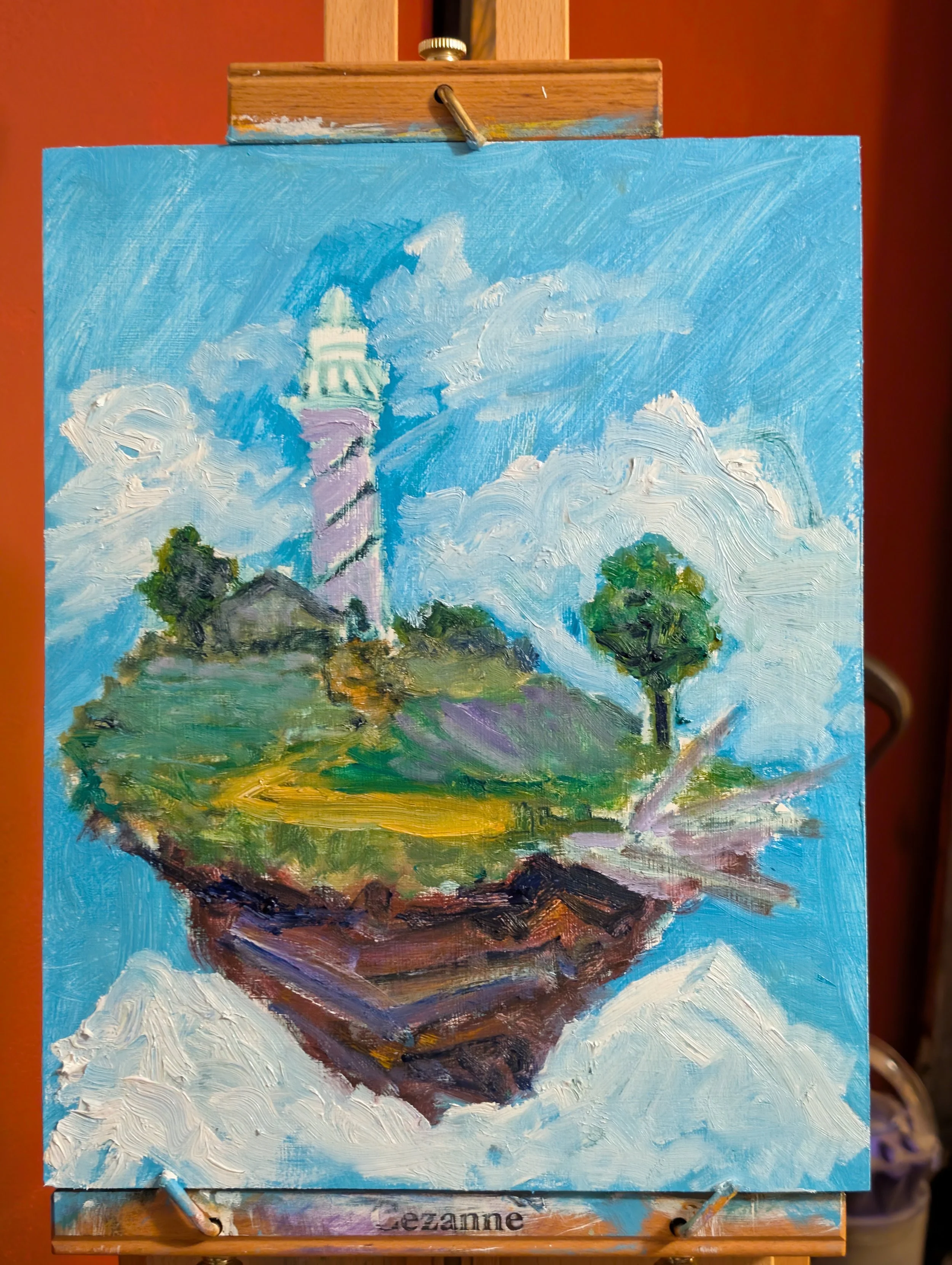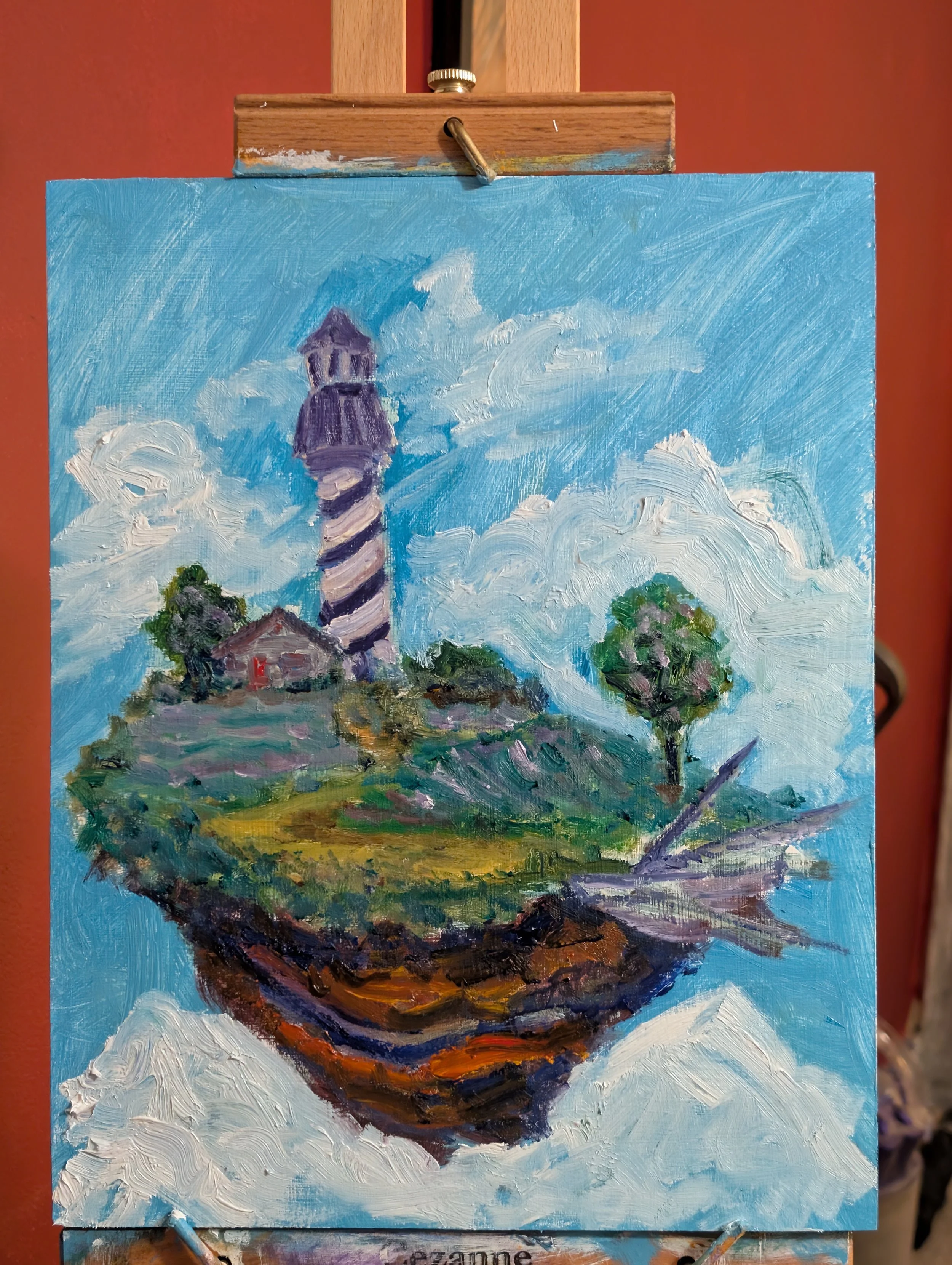 And the saturated highlights for the win. They really work to pull the subject (the top of the island) forward from the background. Introduced cool blues and warm greys to the rocky underside of the island with big brushy strokes to better express the form of the shadow shapes. Also I thing that adding in the other floating bits of floating rock really helped this composition make more sense and added that initial energy back into the painting.